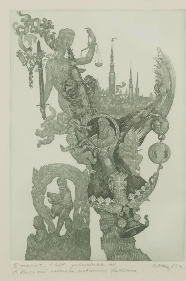 Illustratsioon Jaan Krossi romaanile "Kolme katku vahel". Pehmelakk 1983, III raamat, "B. Russowi kroonika saabumine Tallinna", kujutise mõõdud 25 x 18 cm.