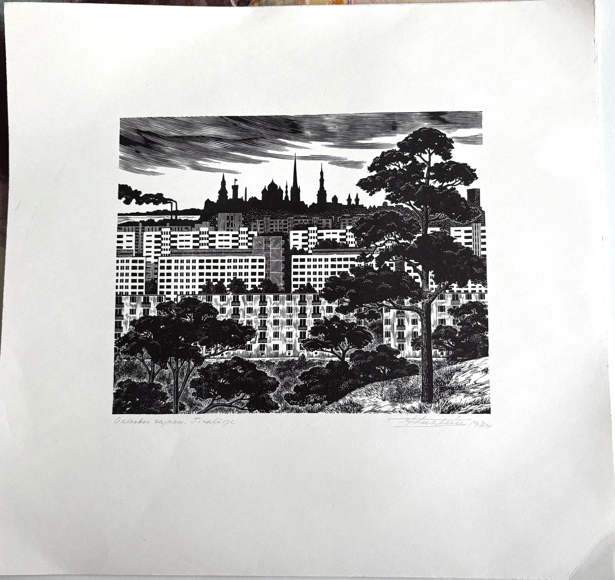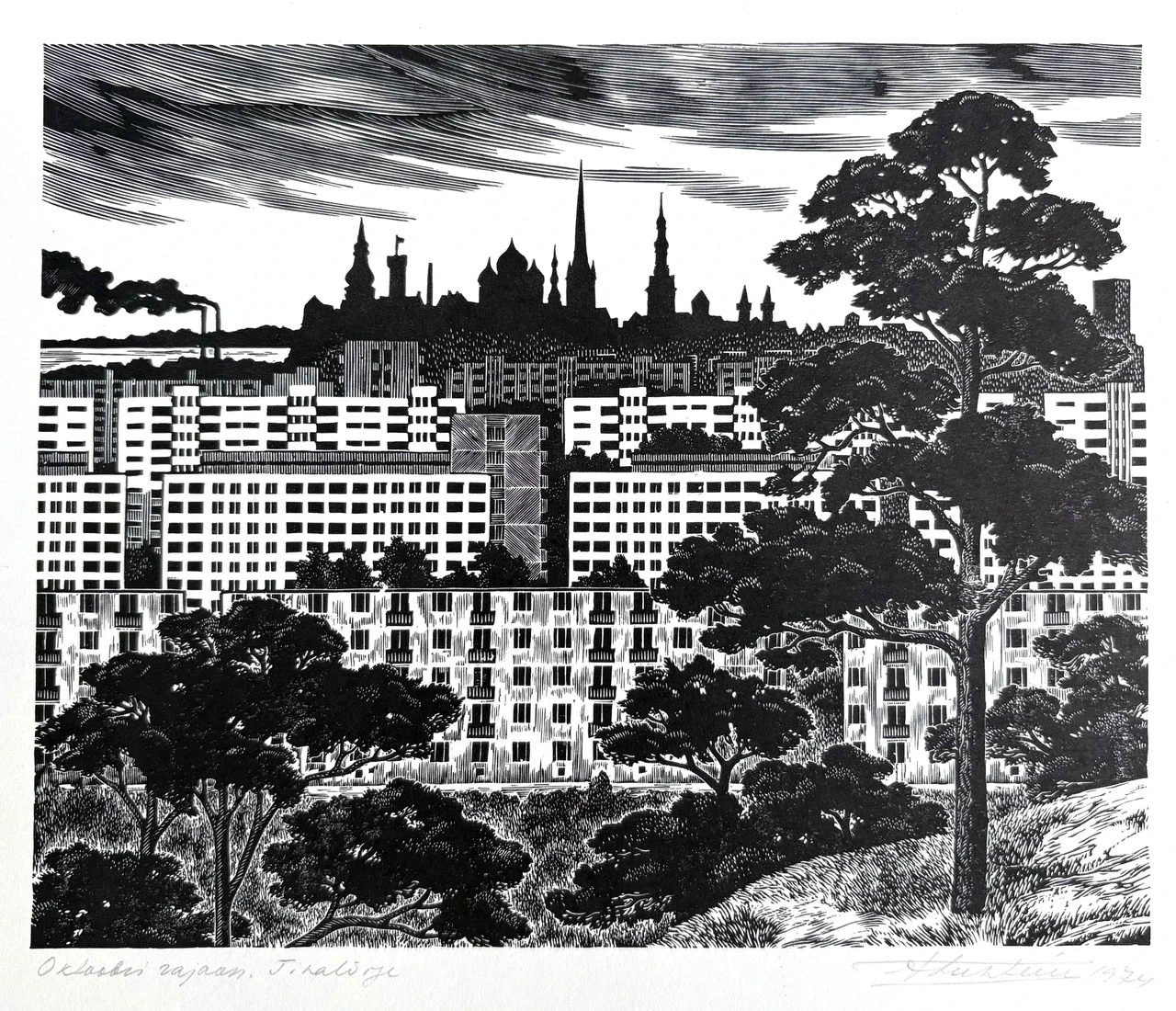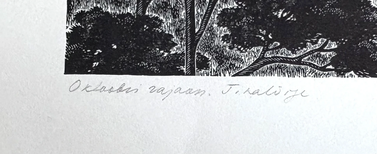 Tinalõige 1974, signeeritud, raamimata. Kujutise mõõdud 19 x 15,5 cm, lehe mõõdud 31 x 29 cm.