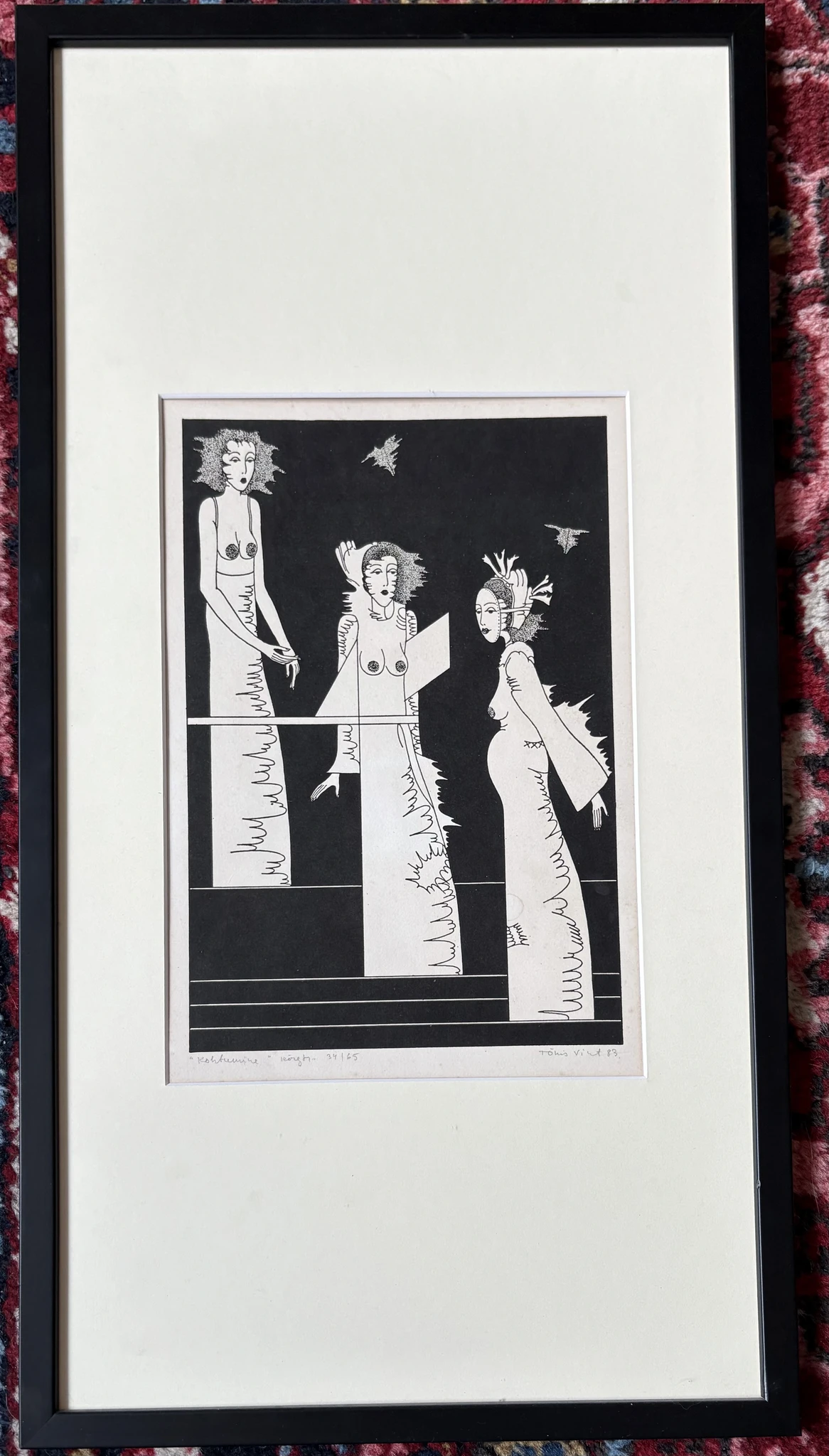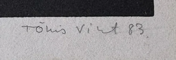 Kõrgtrükk 1983, signeeritud, nummerdatud, raamitud muuseumiklaasiga. Ava mõõdud 20 x 29 cm, raami mõõdud 32 x 61 cm.