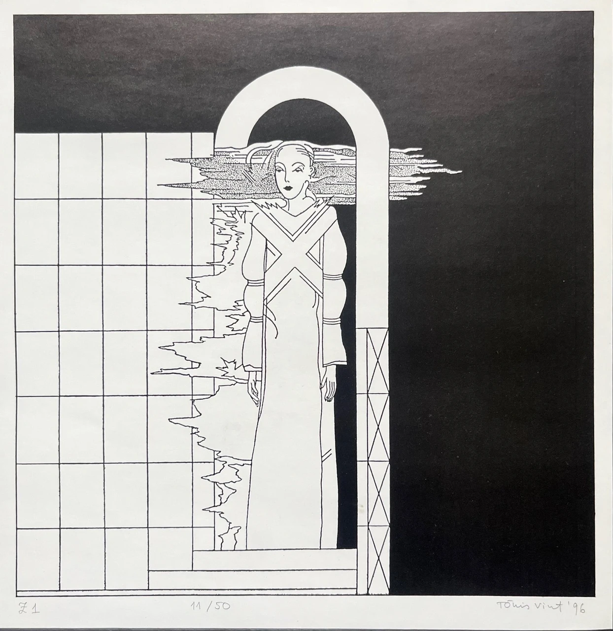 Kõrgtrükk 1996, signeeritud, nummerdatud, raamitud artklaasiga. Ava mõõdud 23 x 24 cm.