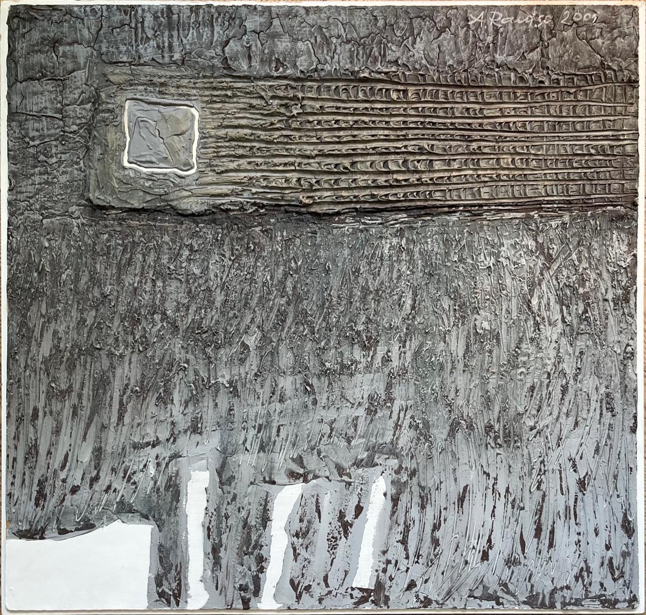 Akrüül, segatehnika, masoniit 2001. Mõõdud koos alusraamiga 69 x 65 cm.