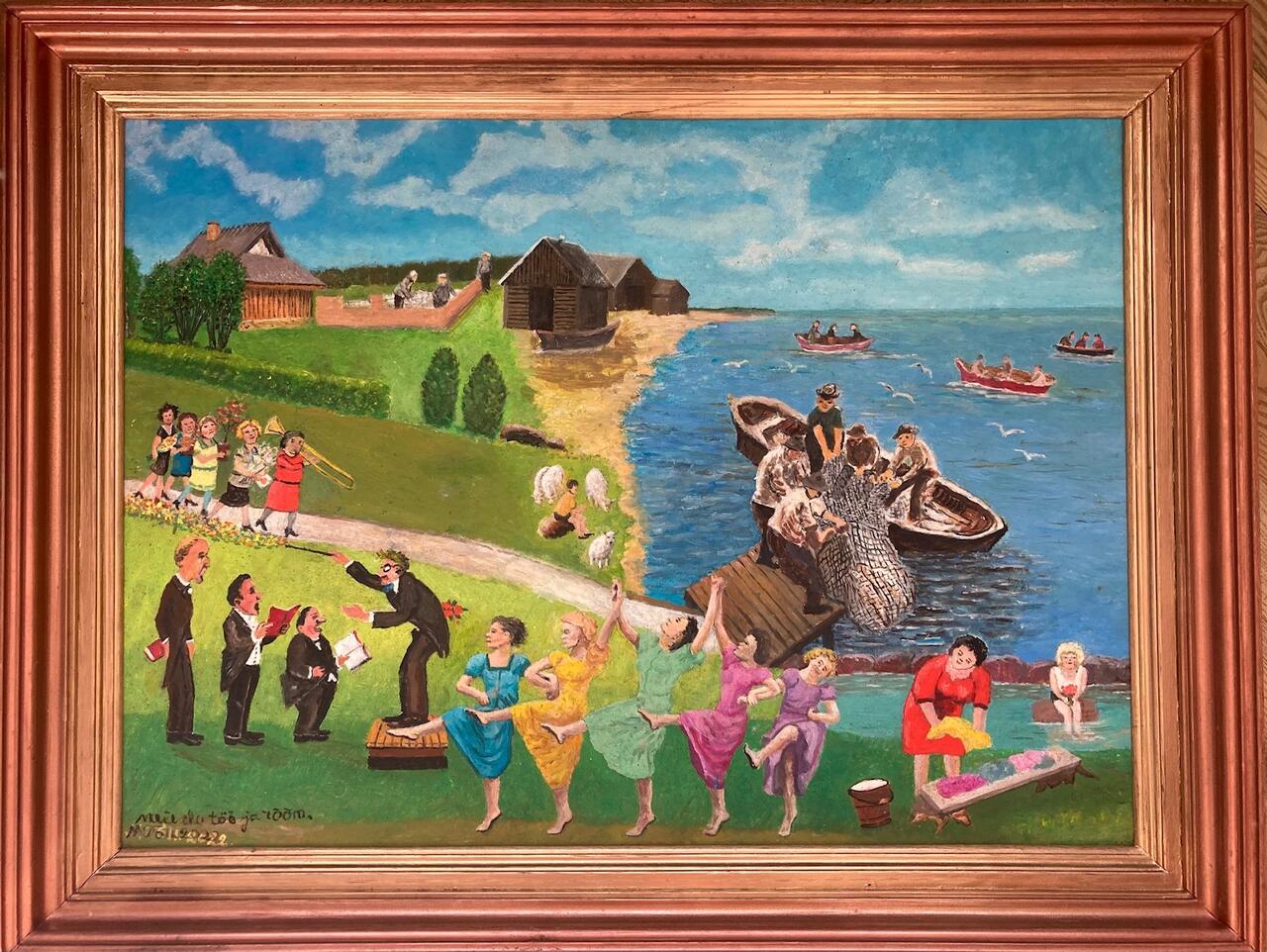 "Meie elu, töö ja rõõm" 2022, õli ja akrüül plaadil. 52 x 72 cm. Saarema naivist, sündinud aastal 1936. Endiselt rõõmus ja tööhoos!