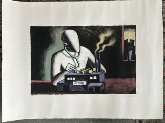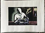 Litograafia 1985, signeeritud, nummerdatud, raamimata. Lehe mõõdud 76 x 56 cm, pladi mõõdud 51 x 33 cm. Varajane Kostabi teos ajast, kui ta New Yorki East Village kunstiskenel laineid lõi.