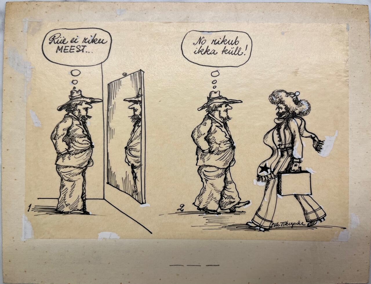 Tuššijoonistus 1976, siidipaber kleebitud paile, lehe mõõdud 17 x 11,5 cm.