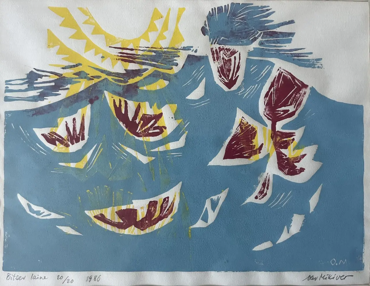 Värviline puulõige 1986. Signeeritud, raamitud, ava mõõdud 25 x 33 cm.